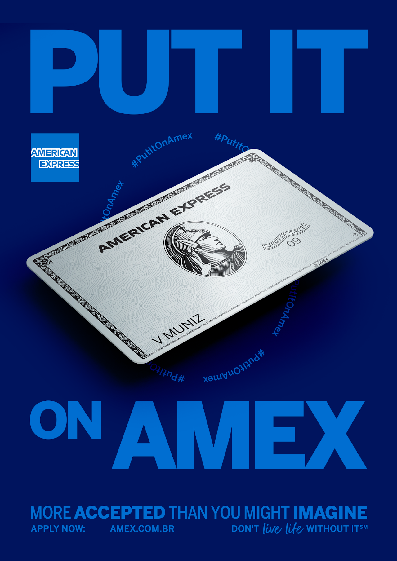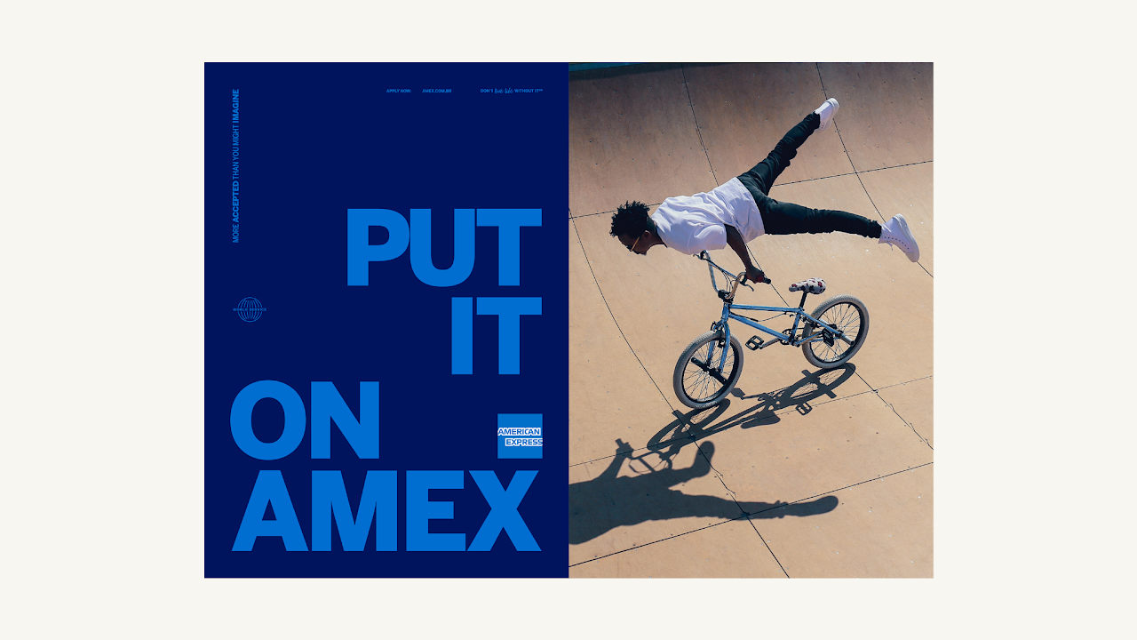 More than a campaign, a rebranding for American Express in Brazil. We decided to embrace a popular saying about the brand, not only in Brazil but worldwide, and use it as a motto, something to take pride in. So, it doesn't matter what you're buying or where you're going, you can always just Put It On Your Amex.