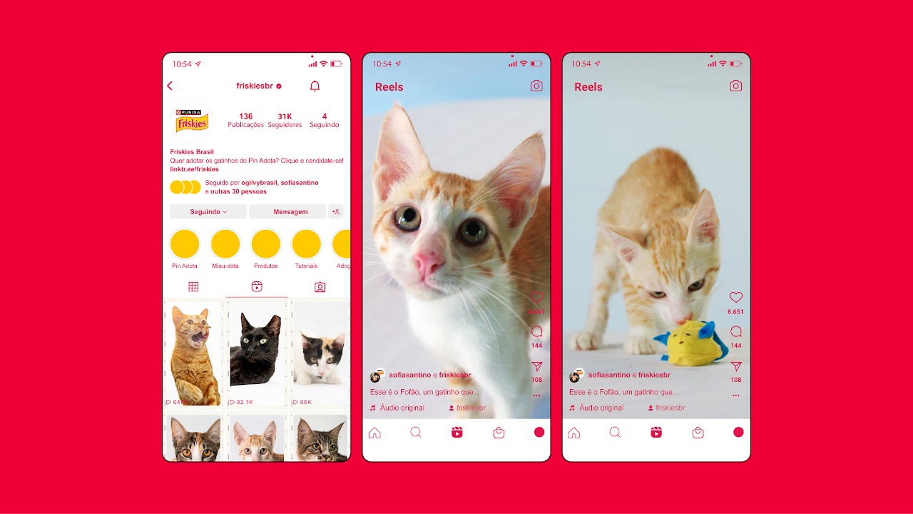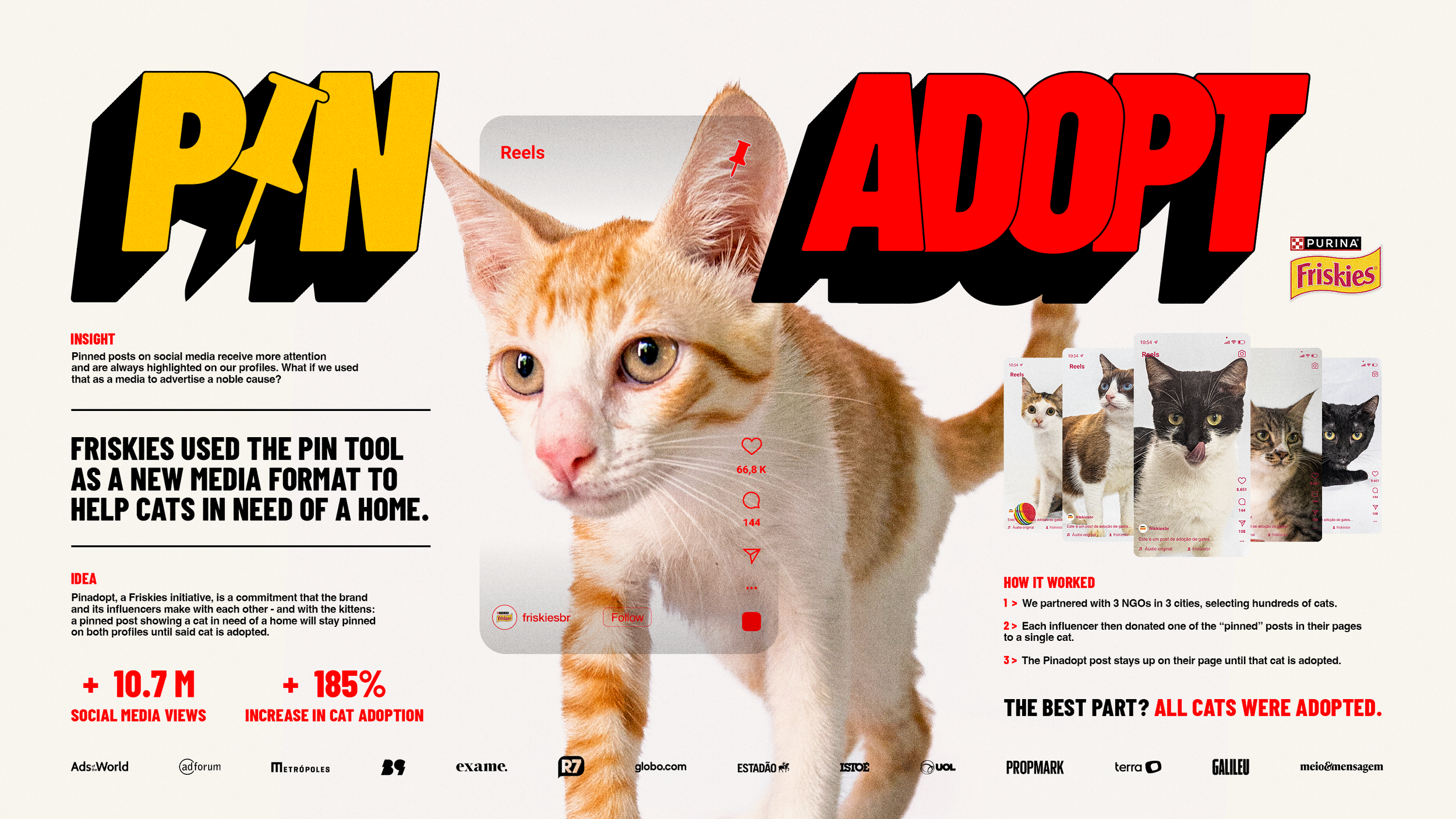 Friskies innovates in media with Instagram's pinned post tool, a first for advertising. Collaborating with influencers, we promote cat adoption through donated pinned posts, supporting a noble cause.